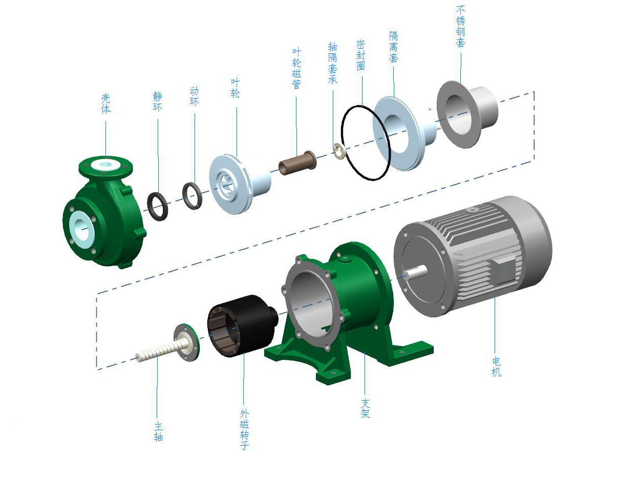 密封材質(zhì):磁力泵靠磁力耦合傳動(dòng),故無(wú)動(dòng)密封件。靜密封件含O型圈、隔離套及加強(qiáng)套。O型圈一般選用氟橡膠材質(zhì),隔離套選用F46材質(zhì),加強(qiáng)套為高電阻、高剛性的非金屬材料,有效避免磁渦流現(xiàn)象。亦可根據(jù)物料特性選擇其他材質(zhì)。