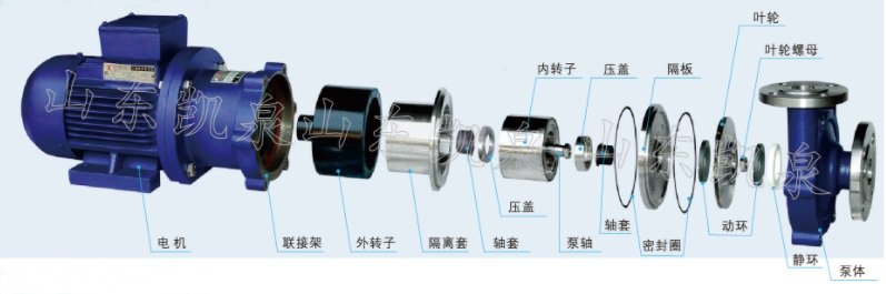 CQ型不銹鋼磁力泵是利用磁力耦合力傳遞扭矩的泵型,當(dāng)電機帶動外磁鋼時,通過磁場的作用驅(qū)動內(nèi)磁鋼轉(zhuǎn)子同步旋轉(zhuǎn),而內(nèi)磁鋼轉(zhuǎn)子和葉輪連成一體,從而達到無接觸帶動葉輪轉(zhuǎn)動之目的。由于液體被封閉在靜止的隔離套內(nèi),所以磁力泵是一種全封閉、無泄漏的泵型,因此杜絕了機械密封離心泵不可避免的跑、冒、滴、漏的弊病。
